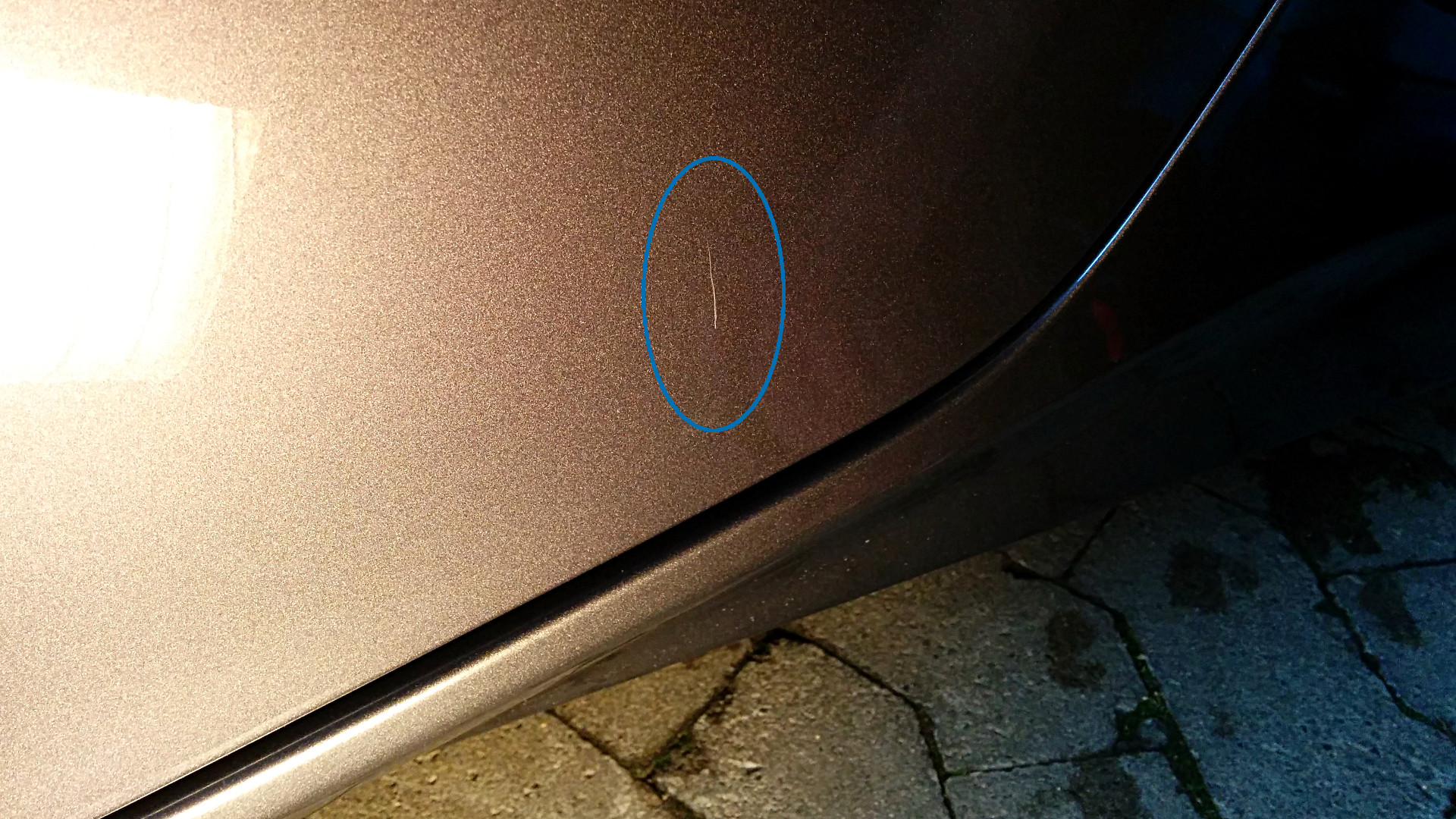Jedenfalls hatte ich als Ersthilfe mittels Handpolitur (auf die ich mangels Strom in meiner Garage angewiesen bin) die gröbsten Schäden beseitigt, allerdings blieben einige tiefere Kratzer zurück, wie man auf dem Foto gut sehen kann. Die Kratzer gingen definitiv nicht bis auf die Grundierung (auch wenn es vorher so aussah und man die Kratzer mit dem Fingernagel deutlich spüren konnte).