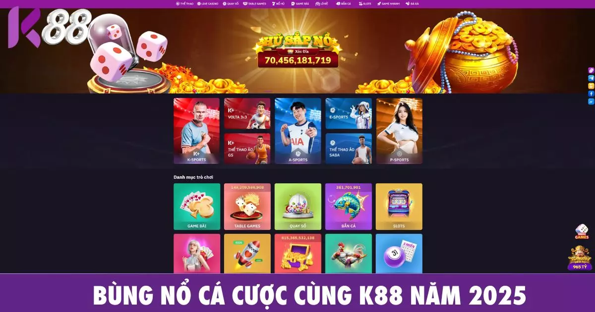 K88 mang đến trải nghiệm cá cược đỉnh cao với sảnh Thể Thao đa dạng, Tài Xỉu xanh chín và Live Casino chuyên nghiệp. Đăng ký K88 ngay để nhận ưu đãi độc quyền!